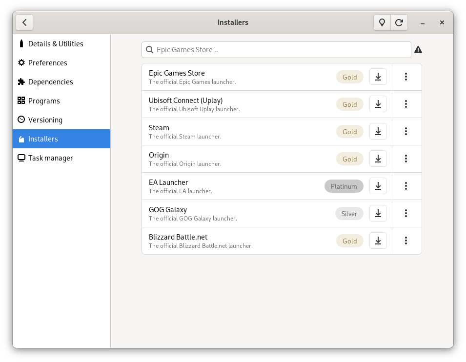 目前只有不多的几个安装程序,主要是第三方游戏启动程序。用户如果想安装像 Origin 这样的程序,可以简单地在他们的首选“瓶子”中进入安装程序部分,点击下载按钮。(LCTT 译注:“瓶子”指一个虚拟环境。)
