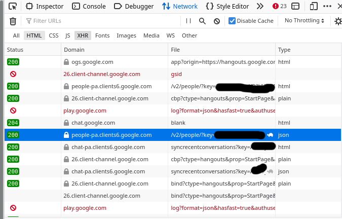 我浏览了 https://hangouts.google.com,在 Firefox 的开发者工具中打开“ 网络 ”标签,找到一个 JSON 响应。你也可以使用 Chrome 的开发者工具。