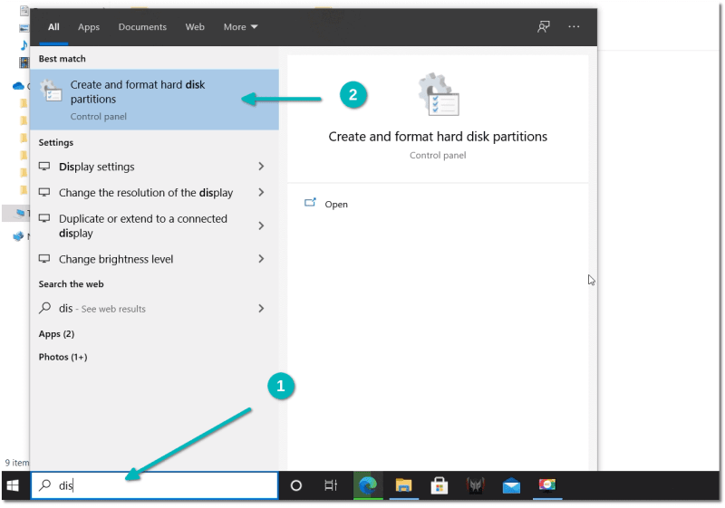 在 Windows 的菜单中,搜索 “磁盘分区” 并转到 “创建并格式化磁盘分区”。