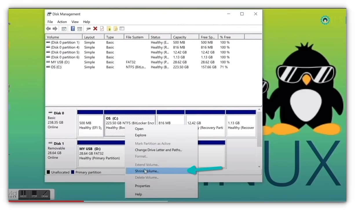 在磁盘管理工具中,右键单件你想要分区的驱动器,并选择 “缩小卷”。