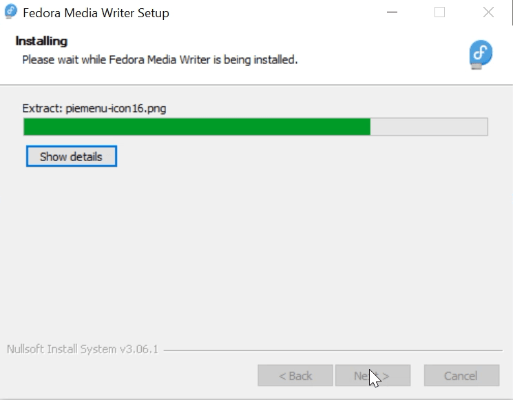 它将下载一个 exe 文件。在下载完成后,转到你所下载到的文件夹,并双击 FedoraMediaWriter.exe 文件来安装 “Fedora Media Writer” 工具。只需要重复点击 “ 下一步 。