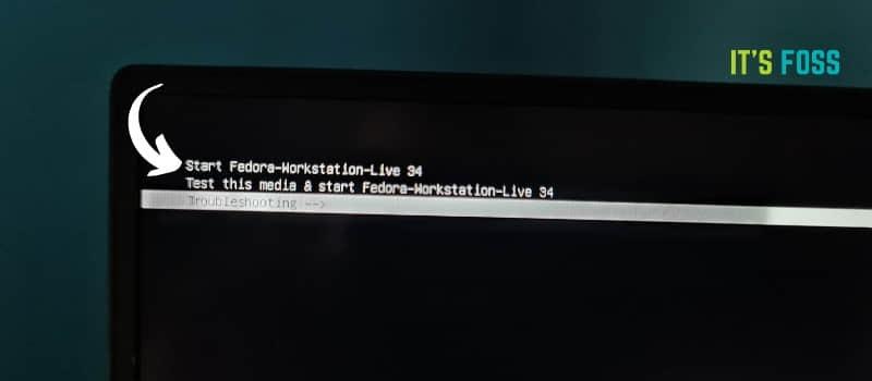 如果一切顺利,你应该会看到像下面的一个屏幕。选择第一个选项 “ 启动 Fedora 工作站 ”: