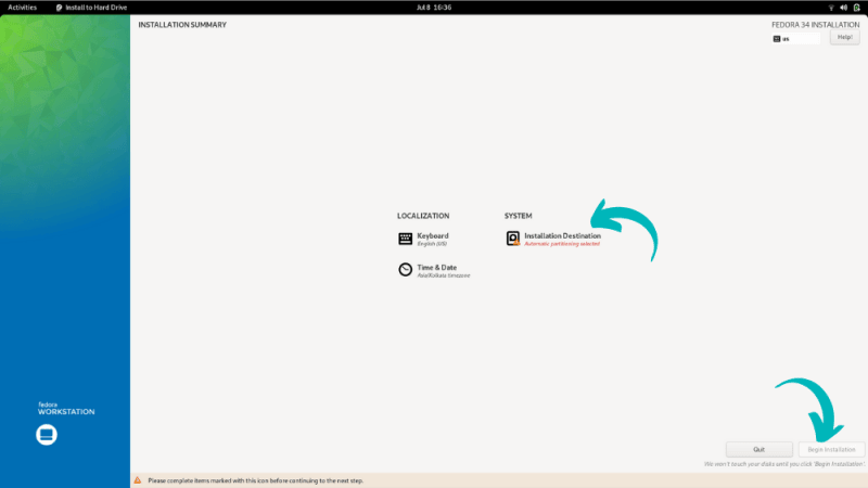 选择磁盘,并点击“ 完成 ” 。现在,你应该会看到一条警告信息。在我的实例中,我没有在 “步骤 2” 中创建可用的空间,因此它会抱怨这里没有足够的可用的空间来安装 Fedora 。