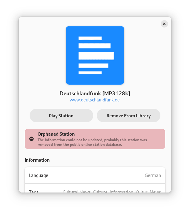 因此,即使一个电台从服务器(radio-browser.info)上删除,它也会保留在应用程序中,并有消息通知用户这一变化。