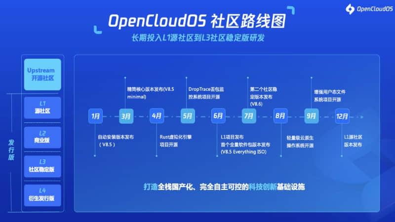 据其官方公众号消息,OpenCloudOS 正式发布了“首个源社区(L1)项目及首个全量软件包(L3)版本”,并披露了技术研发路线图。OpenCloudOS 是去年 12 月由腾讯牵头成立的开源操作系统社区,其成员包括北京红旗、飞腾、浪潮、龙芯中科、兆芯等几十家操作系统生态厂商及用户。OpenCloudOS 在宣传中说它是“我国首个具备全链路国产化能力的服务器操作系统”,并提出了 L1 源社区、L2 商业版、L3 社区稳定版和 L4 衍生发行版的层级划分。OpenCloudOS 称其“社区及衍生版已经装机逾千万”。