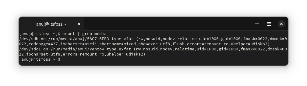 通常,USB 存储挂载在 media 目录中。因此,在媒体上过滤 mount 命令的输出将为你提供所需的结果。