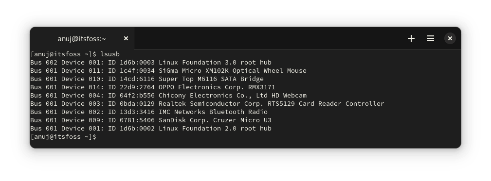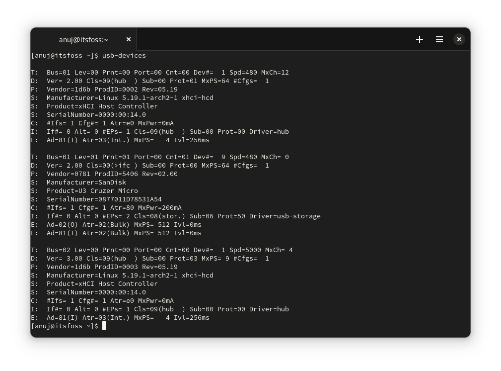 Linux 内核开发人员 Greg Kroah-Hartman 开发了这个方便的 usbutils 程序。这为我们提供了两个命令,即 lsusb 和 usb-devices 来列出 Linux 中的 USB 设备。
