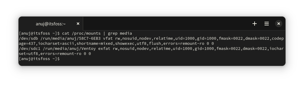 通过检查 /proc/mounts 文件,你可以列出 USB 存储设备。如你所见,它向你显示了文件系统使用的挂载选项以及挂载点。