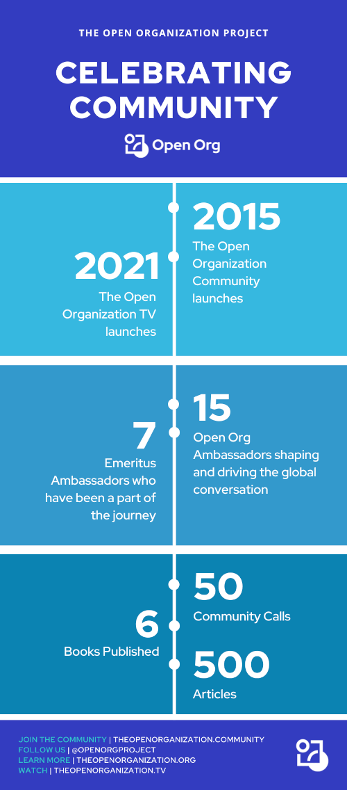 2021 年 6 月 2 日, 开放组织 社区庆祝其成立六周年。这是六年来(上百篇的)文章、(一系列的)书籍、(具有启发性的)对话、(我们所 喜欢的)教学和学习。我们非常自豪地成为一个充满活力的开放专家和领导者的社区,致力于将 开放原则 带到大大小小的组织。事实上,许多 开放组织大使 以帮助他人变得更加开放为职业,我们的社区仍然致力于帮助各行业的领导者以开放的心态和行为融入他们的社区和环境中。