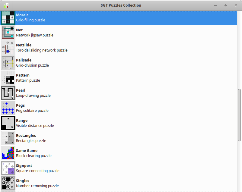 Alt-Tab视图通过更突出的图标进行了改进。 - 马赛克拼图添加到 SGT 拼图系列。