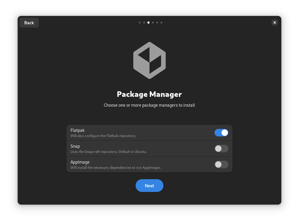 - 在其安装后的首次设置时,允许你选择并启用 Flatpak/Snap/AppImage。