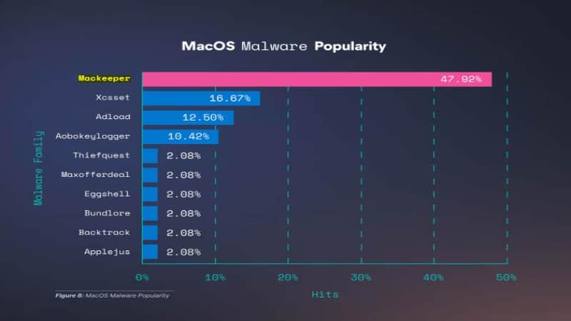 Elastic 安全实验室发现,一半 macOS 恶意软件来自 MacKeeper。讽刺的是,MacKeeper 声称 “以零努力保持你的 Mac 清洁和安全”。该程序可以被威胁者滥用,因为它有广泛的权限和对进程和文件的访问。这意味着,一个旨在保持 Mac 安全不受网络威胁的程序可能使你的系统处于危险之中。 MacKeeper 也以难以完全卸载而著称。然而,Mac 仍然是恶意软件最少的操作系统,研究发现只有 6.2% 的恶意软件出现在 macOS 上,而 Windows 和 Linux 上则分别为 54.4% 和 39.4%。