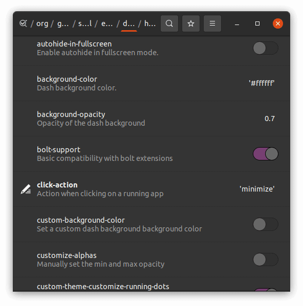 dconf-editor 给你提供了在 Ubuntu 中自定义程序坞的其他选项。你可以在从软件中心安装 dconf-editor,然后导航到 org > gnome > shell > extensions > dash-to-dock,在这里你会找到很多自定义程序坞的选择。