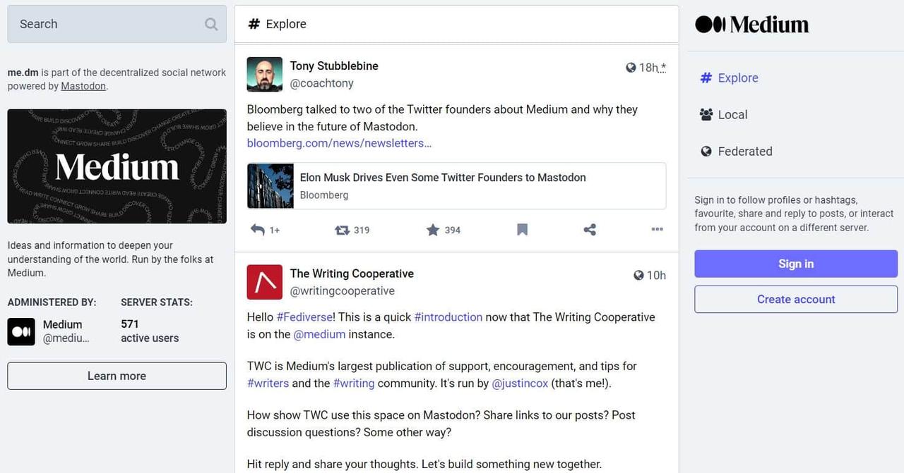 最近的公告 中,Medium 在 me.dm 推出了其 Mastodon 实例,专注于 “帮助他们的作者、出版物和读者在 联盟宇宙 Fediverse 中找到一个家”。