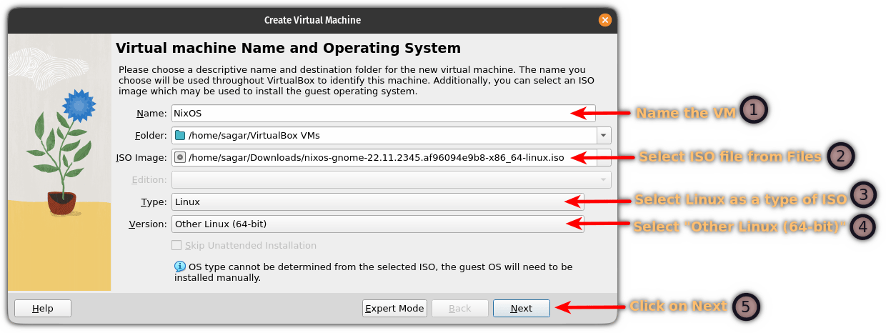 - 为你的虚拟机命名,以便你可以识别它是 NixOS 系统。所以我将其命名为 “NixOS”。