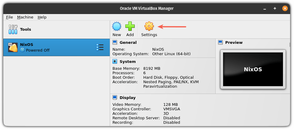 要更改 NixOS 虚拟机 中的启动顺序,请打开该虚拟机的设置: