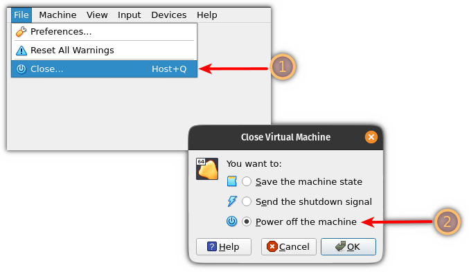 要关闭虚拟机,请从“ 文件 ”菜单中选择 “ 关闭 ” 选项,然后选择 “ 关闭虚拟机电源 ” 选项: