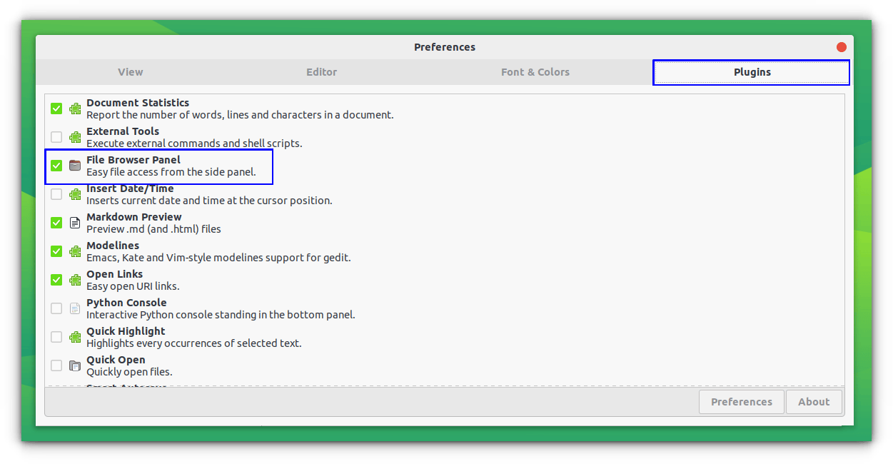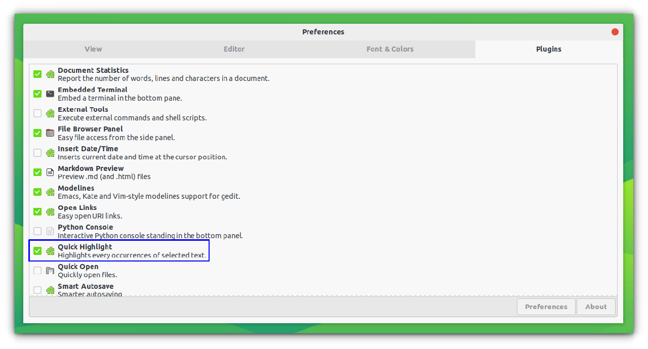 首选项窗口有 “ 插件 ” 标签,你可以看到所有可用的插件。你可以使用复选框来启用和禁用这些插件。