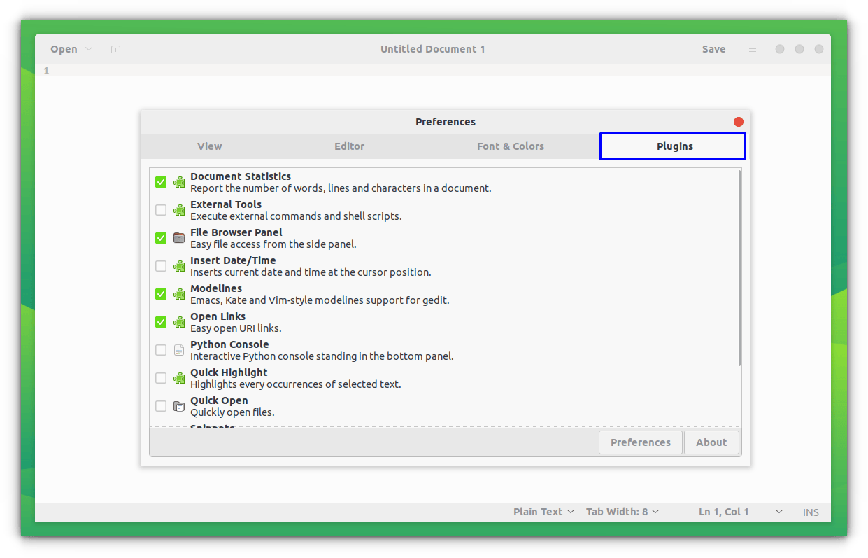 可能个别人甚至不知道 Gedit 有强大的插件功能。你可以安装插件来获得额外的功能。