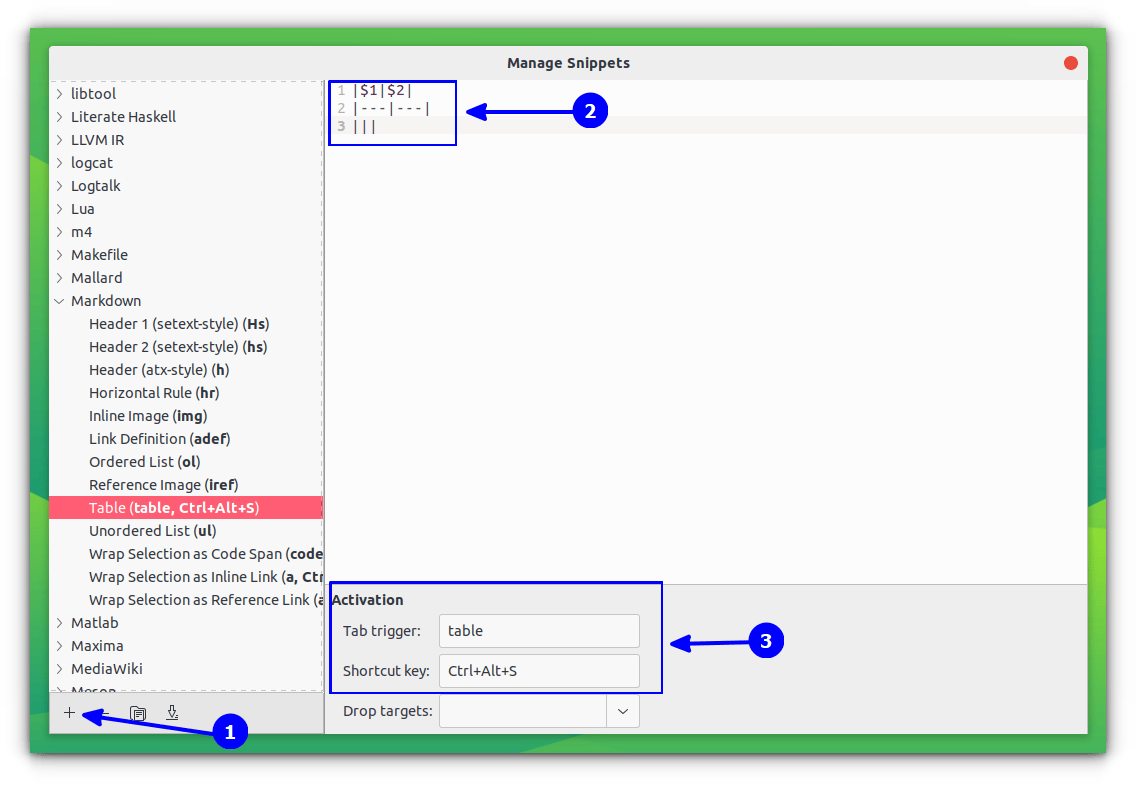 例如,我为 添加一个 Markdown 表格 添加了一个新的片段,并为其分配了一个键盘快捷键和 TAB 触发器(如上图所示)。现在,如果我在 Markdown 文档中按 CTRL + Alt + S,就会添加一个表格。或者,输入 table 并按下 TAB 键也会添加 Markdown 表格。