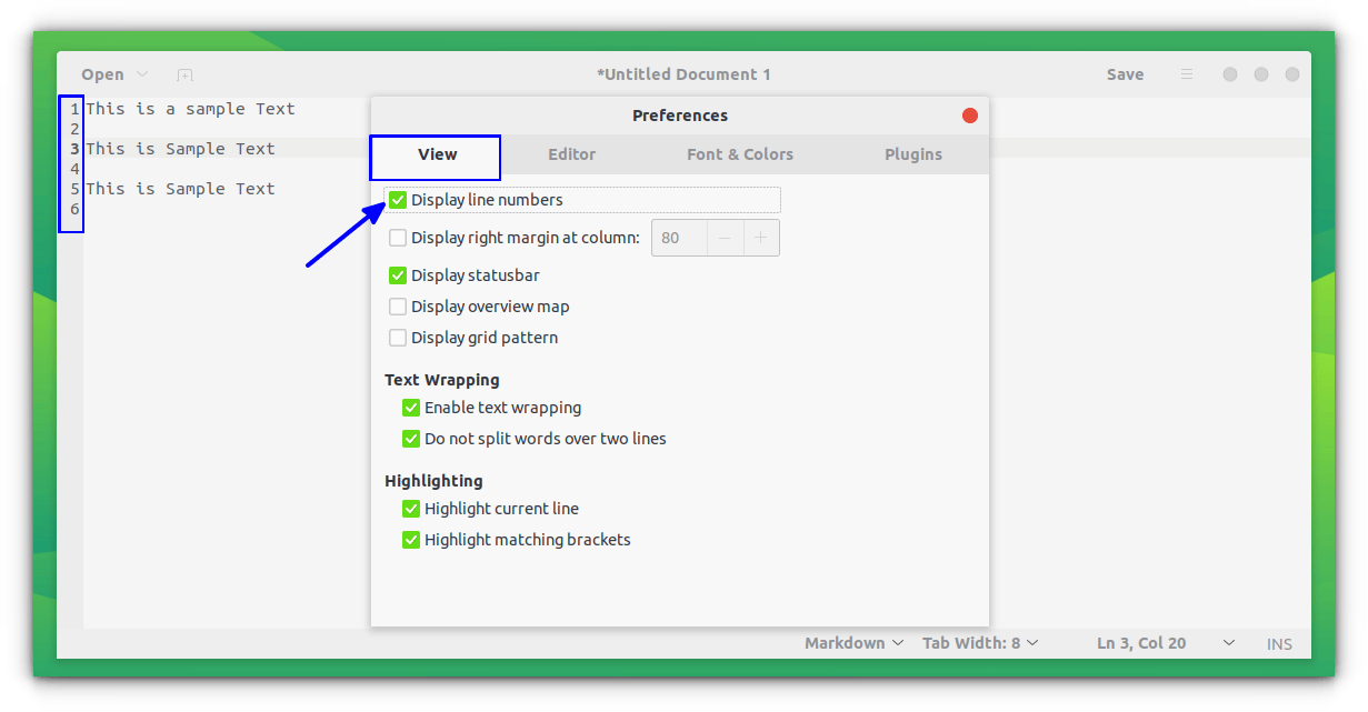 你可以通过进入 “首选项” -> “查看” -> “ 显示行号来启用行号 ”: