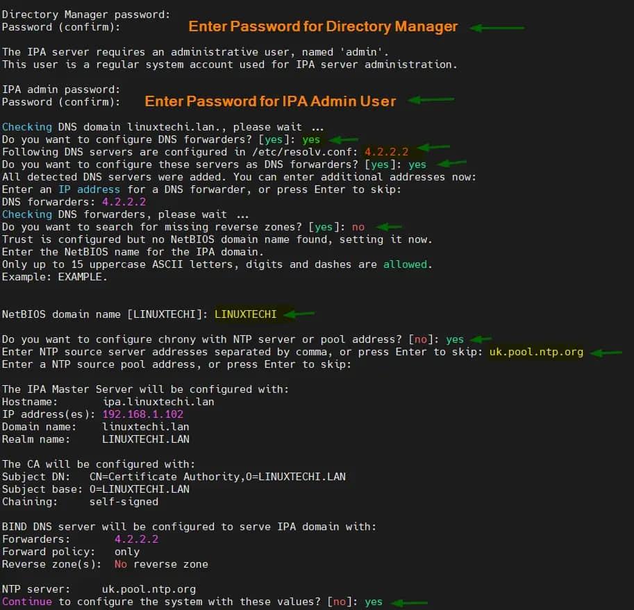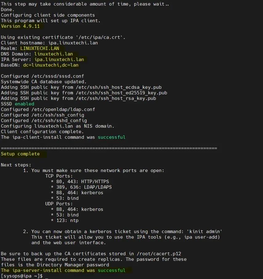 在上面的窗口中输入 “yes” 后,需要一些时间来配置你的 FreeIPA 服务器,设置成功后,我们将得到下面的输出: