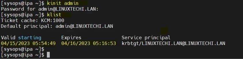 让我们使用 kinit 命令验证管理员用户是否会通过 Kerberos 获取令牌,使用我们在 FreeIPA 安装期间提供的相同管理员用户密码。