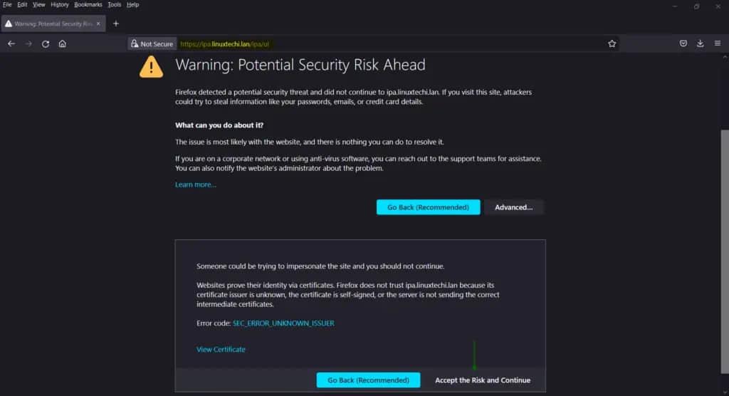 对于 FreeIPA Web 控制台,使用自签名 SSL 证书,这就是我们看到此窗口的原因,因此单击“ 接受风险并继续 ”。