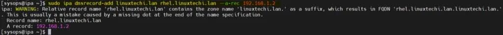 $ sudo ipa dnsrecord-add linuxtechi.lan rhel.linuxtechi.lan --a-rec 192.168.1.2