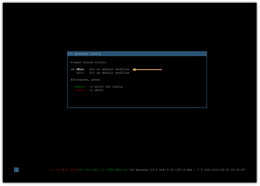 接下来,它会询问你选择 Win 或 Alt 键哪个作为修饰键(mod)。
