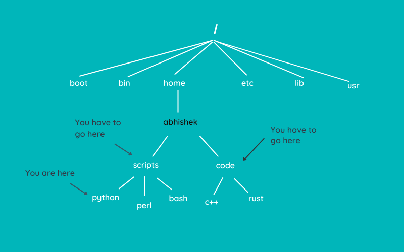 我当前的位置是我的主目录(/home/abhishek),我必须进入 scripts 目录中的 python 目录。