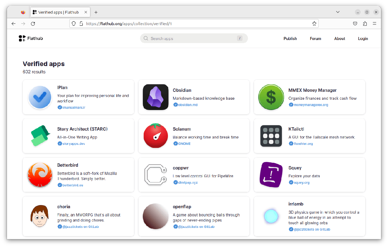 你可以在 Flathub 上浏览 Flatpak 应用,它提供了更多详细信息,例如经过验证的发布商、下载总数等。