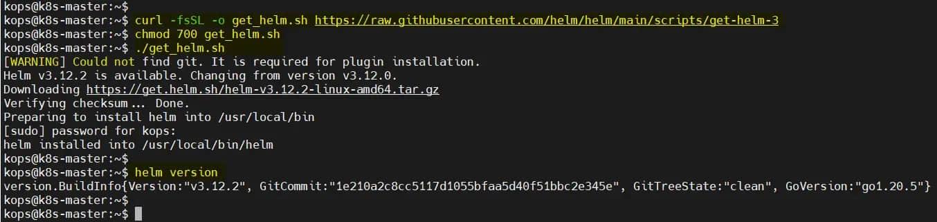 $ curl -fsSL -o get_helm.sh https://raw.githubusercontent.com/helm/helm/main/scripts/get-helm-3 $ chmod 700 get_helm.sh $ ./get_helm.sh