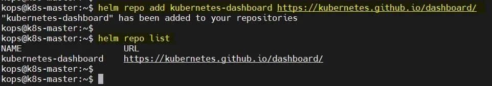 $ helm repo add kubernetes-dashboard https://kubernetes.github.io/dashboard/ $ helm repo list