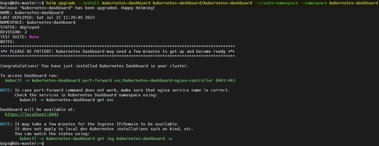 $ helm upgrade --install kubernetes-dashboard kubernetes-dashboard/kubernetes-dashboard --create-namespace --namespace kubernetes-dashboard