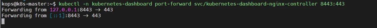 $ kubectl -n kubernetes-dashboard port-forward svc/kubernetes-dashboard-nginx-controller 8443:443