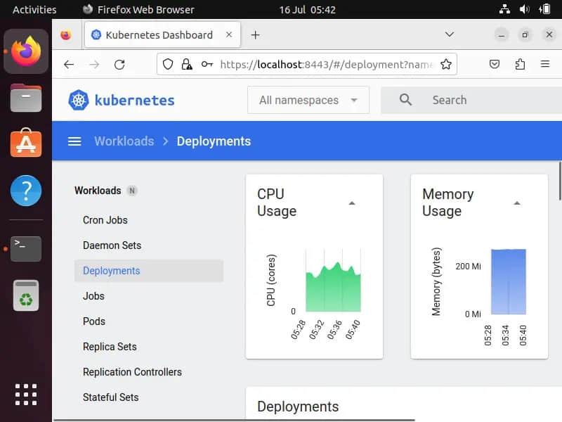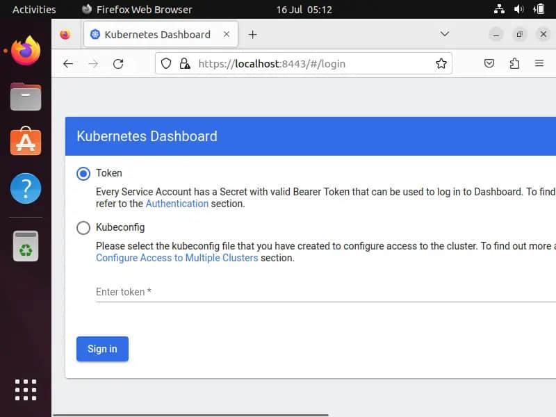 上面的输出确认仪表板已部署在 Kubernetes-dashboard 命名空间中。因此,要访问仪表板,请运行:
