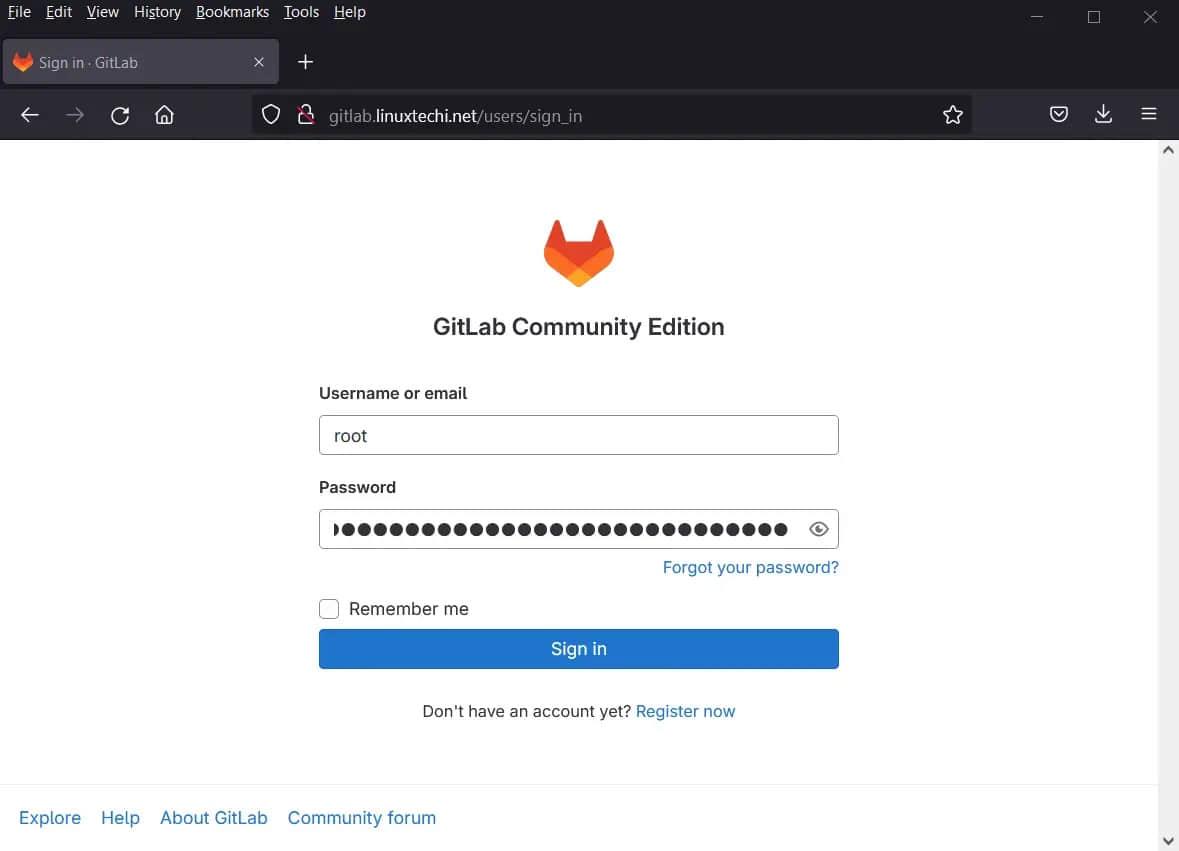 安装并配置 GitLab 后,打开 Web 浏览器并输入服务器的 IP 地址或主机名。