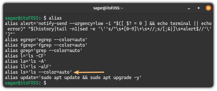 那么为什么 ls 命令在 Ubuntu 和其他一些发行版中默认添加颜色呢? 这是因为你的发行版为 ls 命令设置了别名,以便在执行 ls 命令时使用 --color=auto 标志: