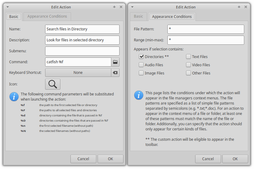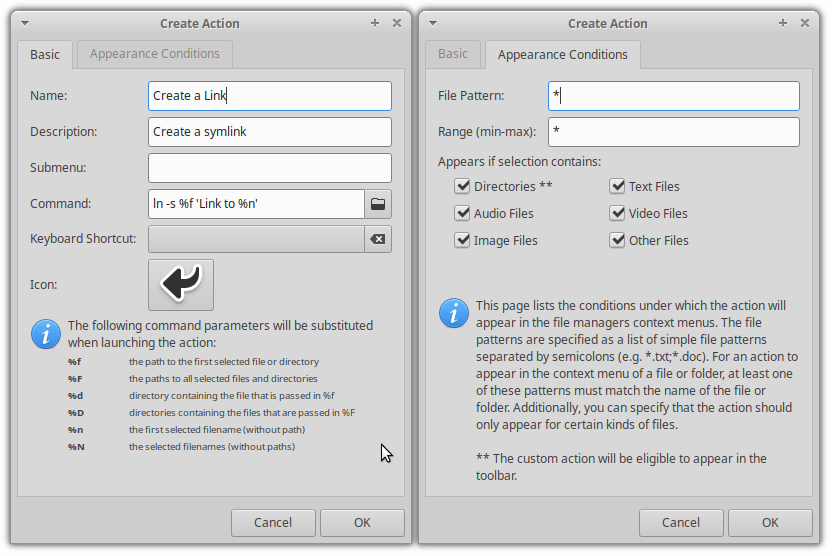 如果你仔细看,你会发现还有另一个名为 “ 出现条件 ” 的选项卡,在这里你可以指定在哪些文件(以及目录)类型的右键菜单中这个动作会出现。