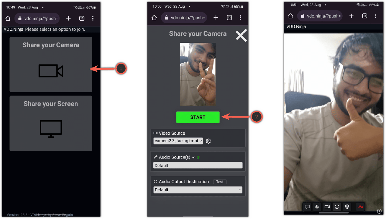首先,用你的手机扫描二维码,它会将你跳转到 VDO.ninja 的另一个页面,此时你需要: