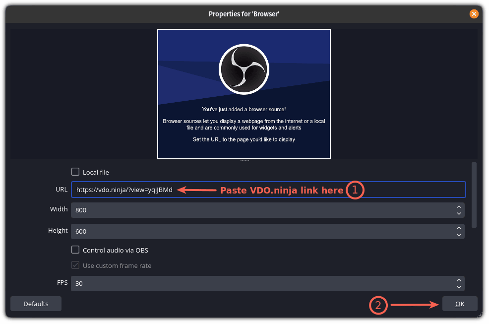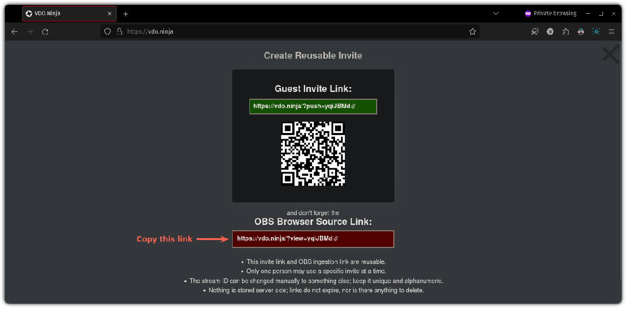 开始阶段,你需要打开我之前告诉你不要关闭的 VDO.ninja 标签页,并复制 OBS 链接: