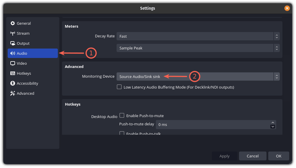 在 “高级” 区域里,你能找到 “ 监控设备 ” 的选项,这里你需要选择 “Source Audio/Sink sink”: