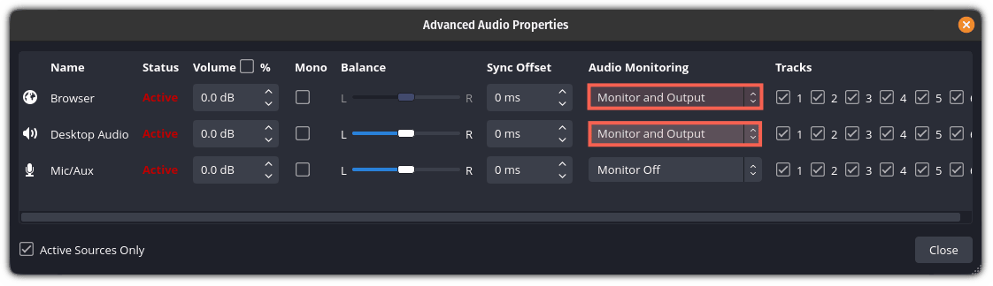 然后,对于 “浏览” 和 “桌面音频”,都选择 “ 监控和输出 ”: