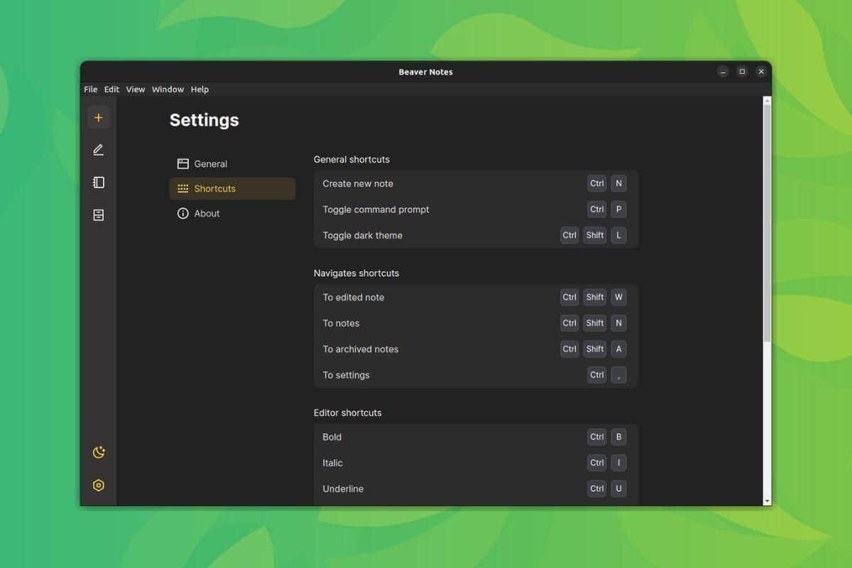 最后,还有 “ 快捷键 Shortcuts ” 菜单,这里列出了在 Beaver Notes 中可用的所有键盘快捷键。