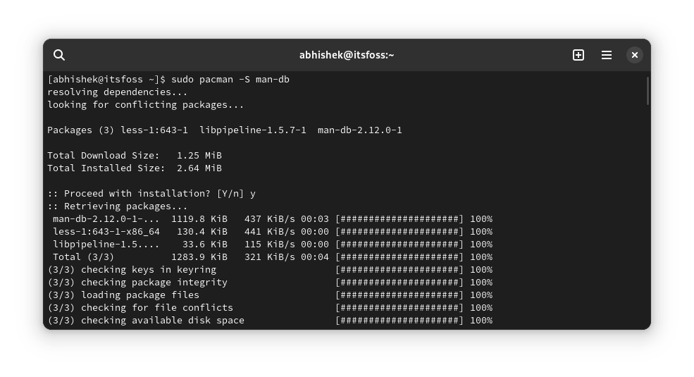 多年后,我再次尝试 Arch Linux。我忘记了 pacman 命令的用法,所以我尝试访问它的手册页。