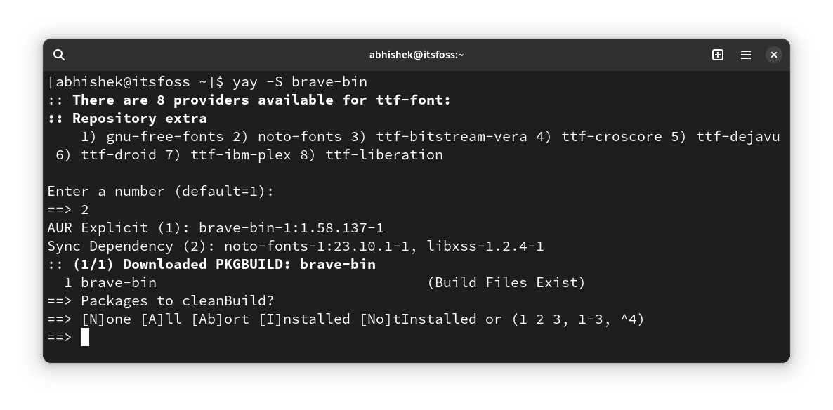 接下来,它会询问你有关清理构建的问题。Yay 询问你是否应该重新下载软件包(和依赖项)并再次构建它或使用早期构建的缓存(如果有)。