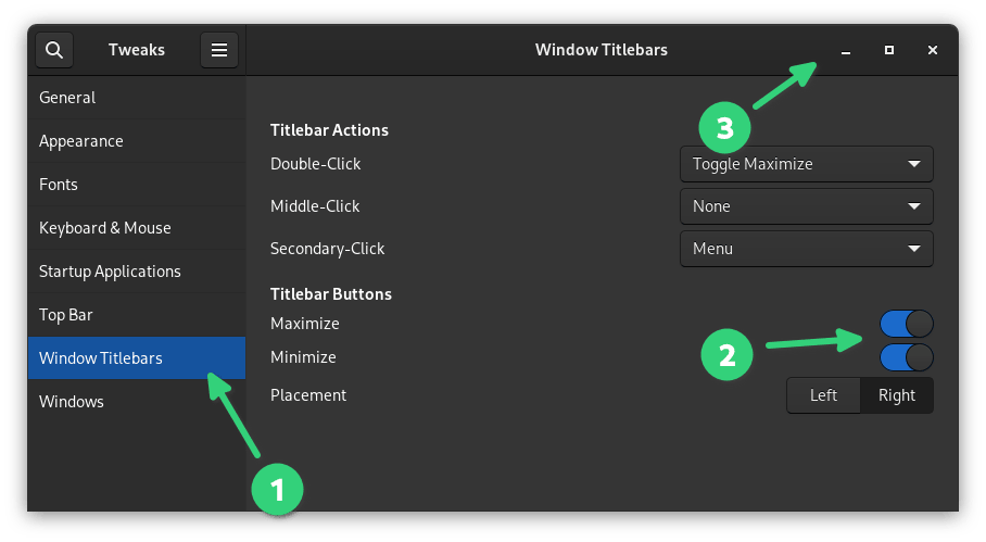 与 Ubuntu 不同,Fedora 和 Arch Linux 等发行版为你提供了原生的 GNOME,但可能让你烦恼的一件事是应用窗口上缺少最小化和最大化按钮。