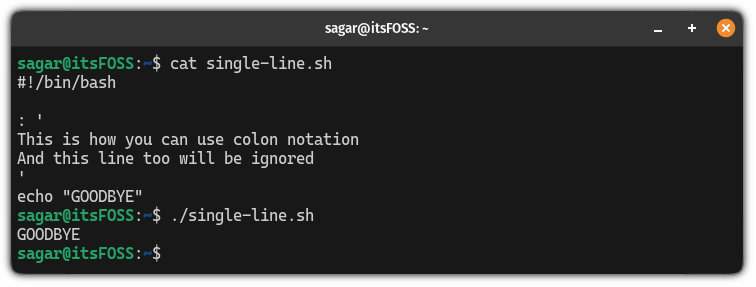 #!/bin/bash : ' This is how you can use colon notation And this line too will be ignored ' echo "GOODBYE"