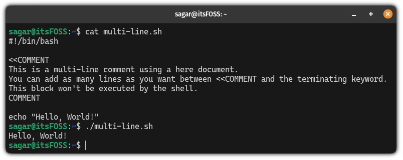 #!/bin/bash <<COMMENT This is a multi-line comment using a here document. You can add as many lines as you want between <<COMMENT and the terminating keyword. This block won't be executed by the shell. COMMENT echo "Hello, World!"